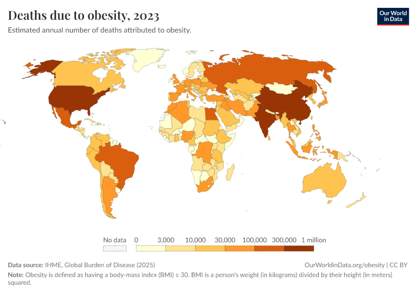 IHME, Global Burden of Disease (2025) – with major processing by Our World in Data. “Deaths due to obesity” [dataset]. IHME, Global Burden of Disease, “Global Burden of Disease - Risk Factors - Deaths” [original data]. Retrieved February 27, 2026 from https://data-chartpreview-unify.owid.pages.dev:8789/20260213-112438/grapher/deaths-due-to-obesity.html (archived on February 13, 2026).