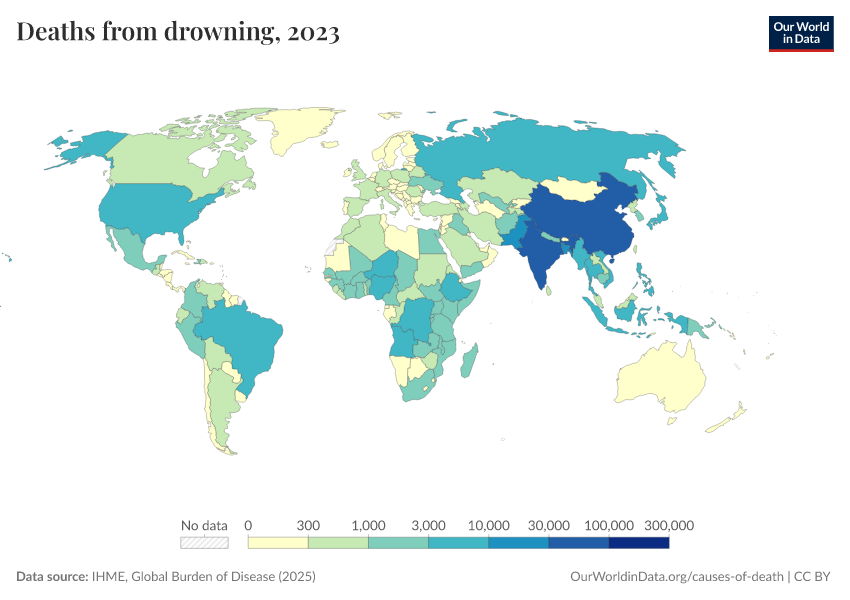 “Data Page: Deaths from drowning”, part of the following publication: Esteban Ortiz-Ospina and Max Roser (2016) - “Global Health”. Data adapted from IHME, Global Burden of Disease. Retrieved from https://data-chartpreview-unify.owid.pages.dev:8789/20260211-174736/grapher/deaths-from-drowning.html [online resource] (archived on February 11, 2026).How to cite this data