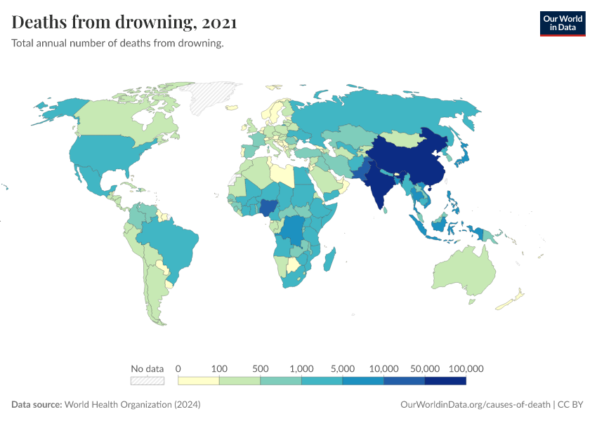 World Health Organization (2024) – with major processing by Our World in Data. “Deaths from drowning” [dataset]. World Health Organization, “Global Health Estimates” [original data]. Retrieved February 27, 2026 from https://data-chartpreview-unify.owid.pages.dev:8789/20250909-093708/grapher/deaths-from-drowning-ghe.html (archived on September 9, 2025).