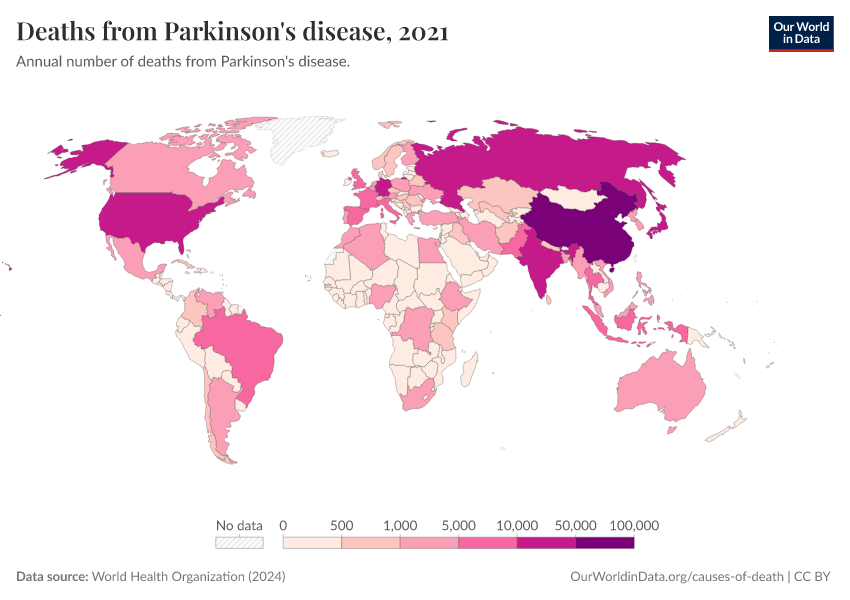World Health Organization (2024) – with major processing by Our World in Data. “Deaths from Parkinson's disease” [dataset]. World Health Organization, “Global Health Estimates” [original data]. Retrieved February 27, 2026 from https://data-chartpreview-unify.owid.pages.dev:8789/20250909-093708/grapher/deaths-from-parkinsons-disease-ghe.html (archived on September 9, 2025).