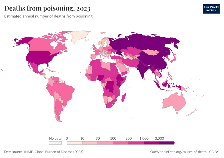 IHME, Global Burden of Disease (2025) – with major processing by Our World in Data. “Deaths from poisoning” [dataset]. IHME, Global Burden of Disease, “Global Burden of Disease - Deaths” [original data]. Retrieved February 27, 2026 from https://data-chartpreview-unify.owid.pages.dev:8789/20260211-174736/grapher/deaths-from-poisoning.html (archived on February 11, 2026).