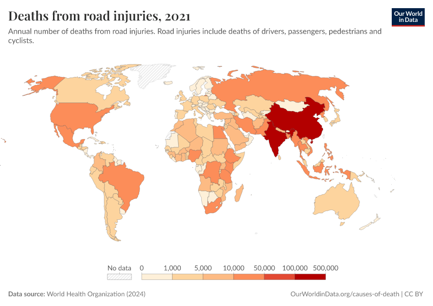 World Health Organization (2024) – with major processing by Our World in Data. “Deaths from road injuries” [dataset]. World Health Organization, “Global Health Estimates” [original data]. Retrieved February 27, 2026 from https://data-chartpreview-unify.owid.pages.dev:8789/20250909-093708/grapher/deaths-from-road-injuries.html (archived on September 9, 2025).