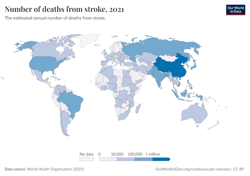 World Health Organization (2024) – with major processing by Our World in Data. “Number of deaths from stroke” [dataset]. World Health Organization, “Global Health Estimates” [original data]. Retrieved February 27, 2026 from https://data-chartpreview-unify.owid.pages.dev:8789/20250909-093708/grapher/deaths-from-strokes-ghe.html (archived on September 9, 2025).