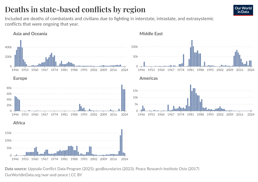 “Data Page: Deaths in state-based conflicts by region”, part of the following publication: Bastian Herre, Lucas Rodés-Guirao, and Max Roser (2024) - “War and Peace”. Data adapted from Uppsala Conflict Data Program, geoBoundaries, Peace Research Institute Oslo. Retrieved from https://data-chartpreview-unify.owid.pages.dev:8789/20260119-070102/grapher/deaths-in-state-based-conflicts-by-region.html [online resource] (archived on January 19, 2026).