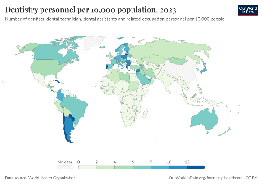 “Data Page: Dentistry personnel per 10,000 population”. Our World in Data (2026). Data adapted from World Health Organization. Retrieved from https://data-chartpreview-unify.owid.pages.dev:8789/20260130-180113/grapher/dentistry-personnel-per-1000.html [online resource] (archived on January 30, 2026).How to cite this data