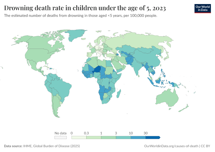 IHME, Global Burden of Disease (2025) – with major processing by Our World in Data. “Drowning death rate in children under the age of 5” [dataset]. IHME, Global Burden of Disease, “Global Burden of Disease - Deaths” [original data]. Retrieved February 27, 2026 from https://data-chartpreview-unify.owid.pages.dev:8789/20260211-174736/grapher/drowning-death-rates-under-5.html (archived on February 11, 2026).