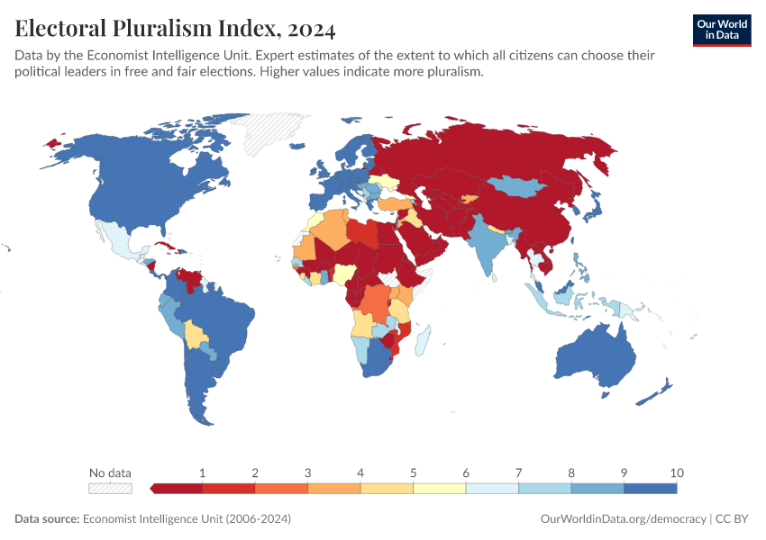 Economist Intelligence Unit (2006-2024) – processed by Our World in Data. “Electoral Pluralism Index” [dataset]. Economist Intelligence Unit, “Democracy Index 2021: The China challenge”; Economist Intelligence Unit, “Democracy Index 2022: Frontline democracy and the battle for Ukraine”; Economist Intelligence Unit, “Democracy Index 2023: Age of Conflict”; Economist Intelligence Unit, “Democracy Index 2024: What's wrong with representative democracy?”; Gapminder, “Democracy Index v4”; Various sources, “Population” [original data]. Retrieved February 27, 2026 from https://data-chartpreview-unify.owid.pages.dev:8789/20260119-070102/grapher/electoral-pluralism-index-eiu.html (archived on January 19, 2026).