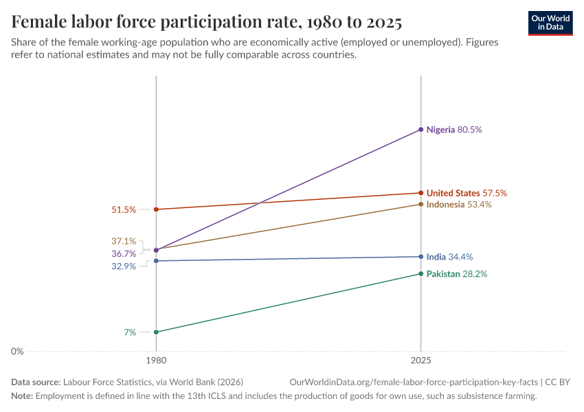 “Data Page: Female labor force participation rate”. Our World in Data (2026). Data adapted from Labour Force Statistics, via World Bank. Retrieved from https://data-chartpreview-unify.owid.pages.dev:8789/20260218-113149/grapher/female-labor-force-participation-rates-slopes.html [online resource] (archived on February 18, 2026).How to cite this data
