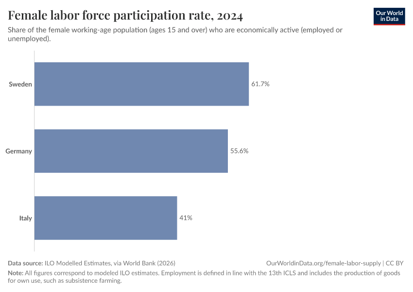 “Data Page: Female labor force participation rate”. Our World in Data (2026). Data adapted from ILO Modelled Estimates, via World Bank. Retrieved from https://data-chartpreview-unify.owid.pages.dev:8789/20260223-234835/grapher/female-labor-force-participation-rates.html [online resource] (archived on February 23, 2026).