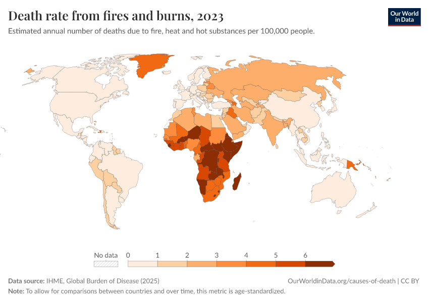 IHME, Global Burden of Disease (2025) – with major processing by Our World in Data. “Death rate from fires and burns” [dataset]. IHME, Global Burden of Disease, “Global Burden of Disease - Deaths” [original data]. Retrieved February 27, 2026 from https://data-chartpreview-unify.owid.pages.dev:8789/20260211-173942/grapher/fire-death-rates.html (archived on February 11, 2026).