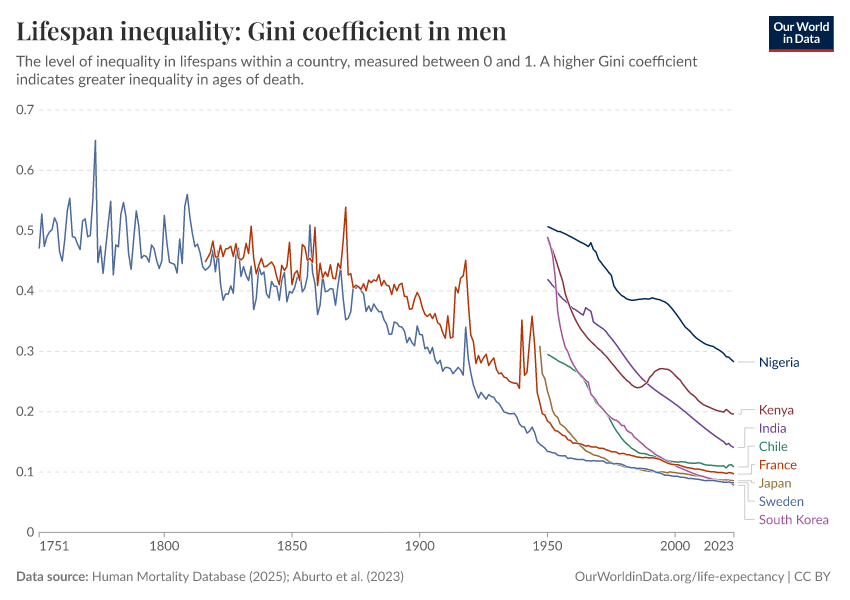 “Data Page: Lifespan inequality: Gini coefficient in men”, part of the following publication: Saloni Dattani, Lucas Rodés-Guirao, Hannah Ritchie, Esteban Ortiz-Ospina, and Max Roser (2023) - “Life Expectancy”. Data adapted from Human Mortality Database, United Nations. Retrieved from https://data-chartpreview-unify.owid.pages.dev:8789/20251022-222946/grapher/gini-coefficient-of-lifespan-inequality-in-males.html [online resource] (archived on October 22, 2025).How to cite this data