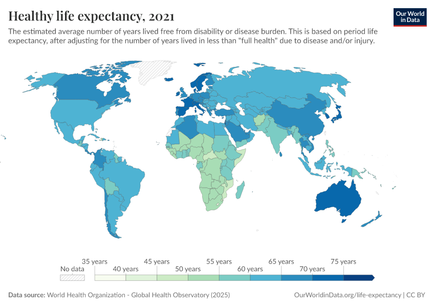 “Data Page: Healthy life expectancy”. Our World in Data (2026). Data adapted from World Health Organization. Retrieved from https://data-chartpreview-unify.owid.pages.dev:8789/20260119-070102/grapher/healthy-life-expectancy-at-birth.html [online resource] (archived on January 19, 2026).How to cite this data