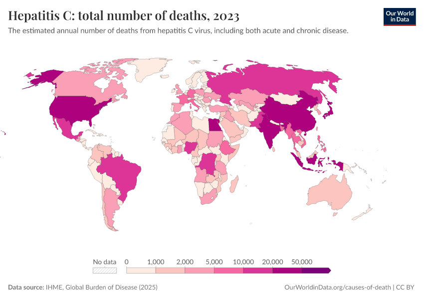 “Data Page: Hepatitis C: total number of deaths”, part of the following publication: Esteban Ortiz-Ospina and Max Roser (2016) - “Global Health”. Data adapted from IHME, Global Burden of Disease. Retrieved from https://data-chartpreview-unify.owid.pages.dev:8789/20260211-174736/grapher/hepatitis-c-number-of-deaths.html [online resource] (archived on February 11, 2026).How to cite this data