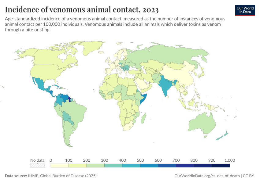 IHME, Global Burden of Disease (2025) – with major processing by Our World in Data. “Incidence of venomous animal contact” [dataset]. IHME, Global Burden of Disease, “Global Burden of Disease - Prevalence and Incidence” [original data]. Retrieved February 27, 2026 from https://data-chartpreview-unify.owid.pages.dev:8789/20260212-172132/grapher/incidence-of-venomous-animal-contact.html (archived on February 12, 2026).