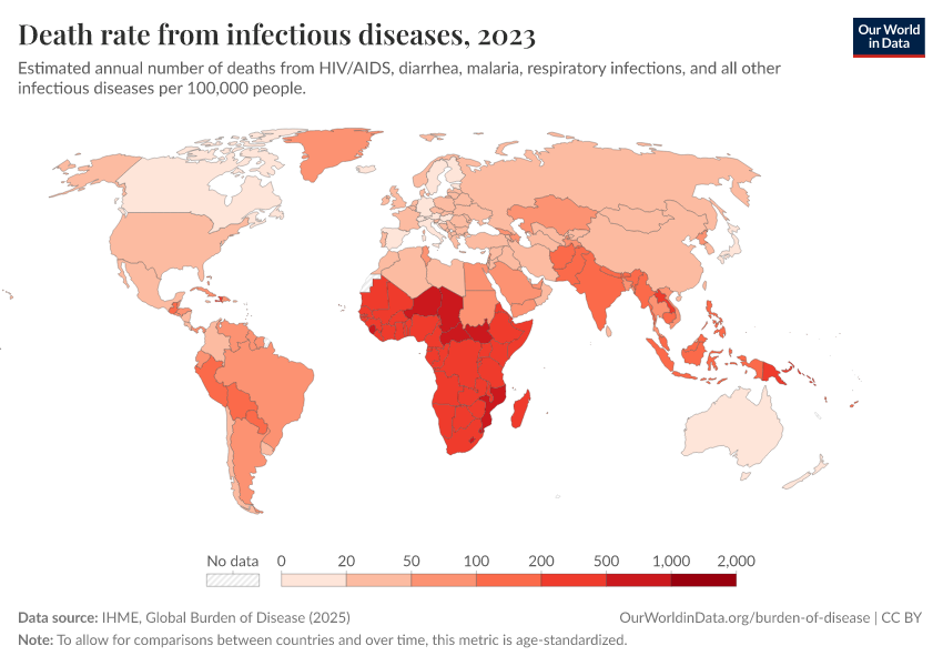 IHME, Global Burden of Disease (2025) – with major processing by Our World in Data. “Death rate from infectious diseases” [dataset]. IHME, Global Burden of Disease, “Global Burden of Disease - Deaths” [original data]. Retrieved February 27, 2026 from https://data-chartpreview-unify.owid.pages.dev:8789/20260211-174736/grapher/infectious-disease-death-rates.html (archived on February 11, 2026).