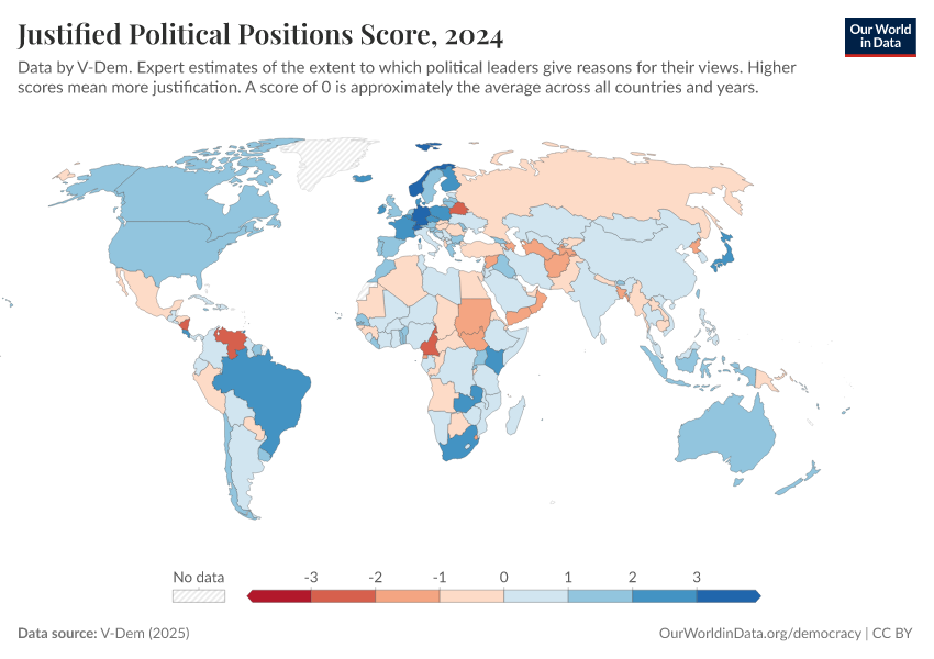 “Data Page: Justified political positions”, part of the following publication: Bastian Herre, Lucas Rodés-Guirao, and Esteban Ortiz-Ospina (2013) - “Democracy”. Data adapted from V-Dem. Retrieved from https://data-chartpreview-unify.owid.pages.dev:8789/20260204-170225/grapher/justified-political-positions-score.html [online resource] (archived on February 4, 2026).How to cite this data