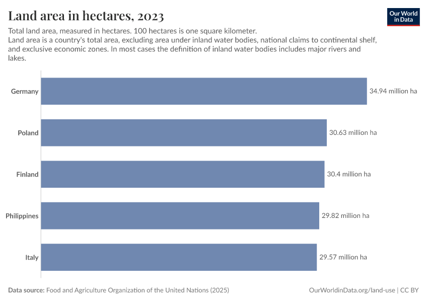 Food and Agriculture Organization of the United Nations (2024) – with major processing by Our World in Data. “Land area in hectares – UN FAO” [dataset]. Food and Agriculture Organization of the United Nations, “Land, Inputs and Sustainability: Land Use” [original data]. Retrieved February 27, 2026 from https://data-chartpreview-unify.owid.pages.dev:8789/20260119-235736/grapher/land-area-hectares.html (archived on January 19, 2026).