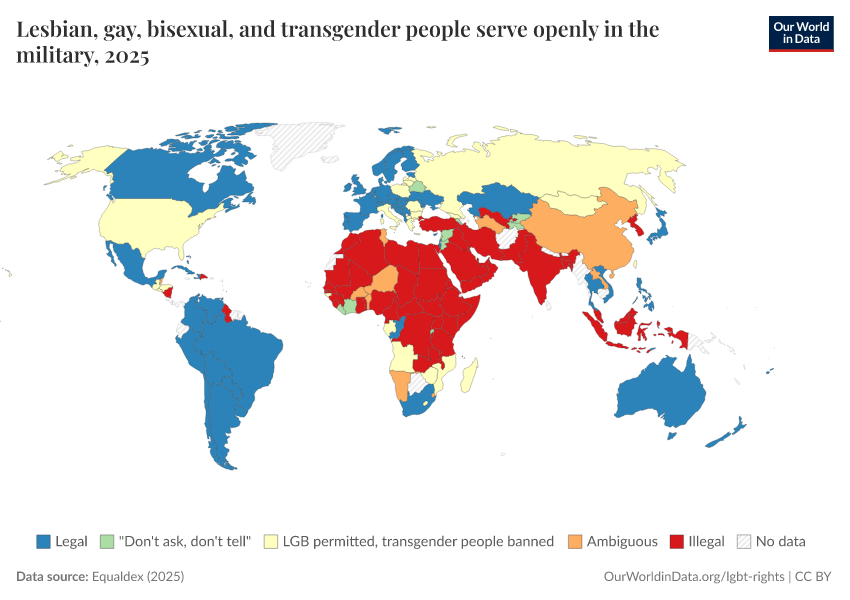 “Data Page: Lesbian, gay, bisexual, and transgender people serve openly in the military”, part of the following publication: Bastian Herre and Pablo Arriagada (2023) - “LGBT+ Rights”. Data adapted from Equaldex. Retrieved from https://data-chartpreview-unify.owid.pages.dev:8789/20250909-093708/grapher/lgbt-military-equaldex.html [online resource] (archived on September 9, 2025).How to cite this data