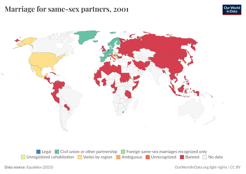 “Data Page: Marriage for same-sex partners”, part of the following publication: Bastian Herre and Pablo Arriagada (2023) - “LGBT+ Rights”. Data adapted from Equaldex. Retrieved from https://data-chartpreview-unify.owid.pages.dev:8789/20250909-093708/grapher/marriage-same-sex-partners-equaldex.html [online resource] (archived on September 9, 2025).