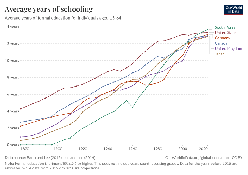 Barro and Lee (2015); Lee and Lee (2016) – with major processing by Our World in Data. “Average years of schooling” [dataset]. Barro and Lee, “Projections of Educational Attainment”; Lee and Lee, “Human Capital in the Long Run” [original data]. Retrieved February 27, 2026 from https://data-chartpreview-unify.owid.pages.dev:8789/20260119-070102/grapher/mean-years-of-schooling-long-run.html (archived on January 19, 2026).