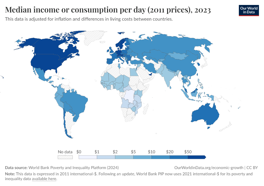 “Data Page: Median income or consumption per day (2011 prices)”, part of the following publication: Joe Hasell, Bertha Rohenkohl, Pablo Arriagada, Esteban Ortiz-Ospina, and Max Roser (2022) - “Poverty”. Data adapted from World Bank Poverty and Inequality Platform. Retrieved from https://data-chartpreview-unify.owid.pages.dev:8789/20251022-091218/grapher/median-income-or-consumption-per-day-2011-prices.html [online resource] (archived on October 22, 2025).
