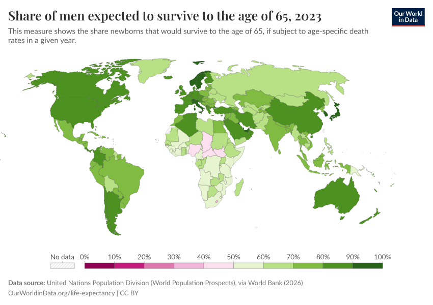 “Data Page: Share of men expected to survive to the age of 65”. Our World in Data (2026). Data adapted from United Nations Population Division (World Population Prospects), via World Bank. Retrieved from https://data-chartpreview-unify.owid.pages.dev:8789/20260202-181317/grapher/men-survival-to-age-65.html [online resource] (archived on February 2, 2026).How to cite this data