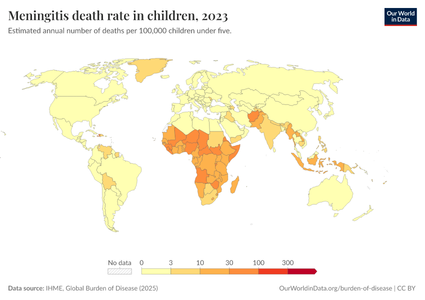 IHME, Global Burden of Disease (2025) – with major processing by Our World in Data. “Meningitis death rate in children” [dataset]. IHME, Global Burden of Disease, “Global Burden of Disease - Deaths” [original data]. Retrieved February 27, 2026 from https://data-chartpreview-unify.owid.pages.dev:8789/20260211-174736/grapher/meningitis-death-rates-children-under-5.html (archived on February 11, 2026).