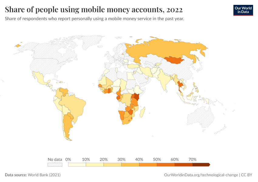 “Data Page: Share of people using mobile money accounts”, part of the following publication: Max Roser, Bertha Rohenkohl, Pablo Arriagada, Joe Hasell, Hannah Ritchie, and Esteban Ortiz-Ospina (2023) - “Economic Growth”. Data adapted from World Bank. Retrieved from https://data-chartpreview-unify.owid.pages.dev:8789/20250909-093708/grapher/mobile-money-account-usage.html [online resource] (archived on September 9, 2025).How to cite this data