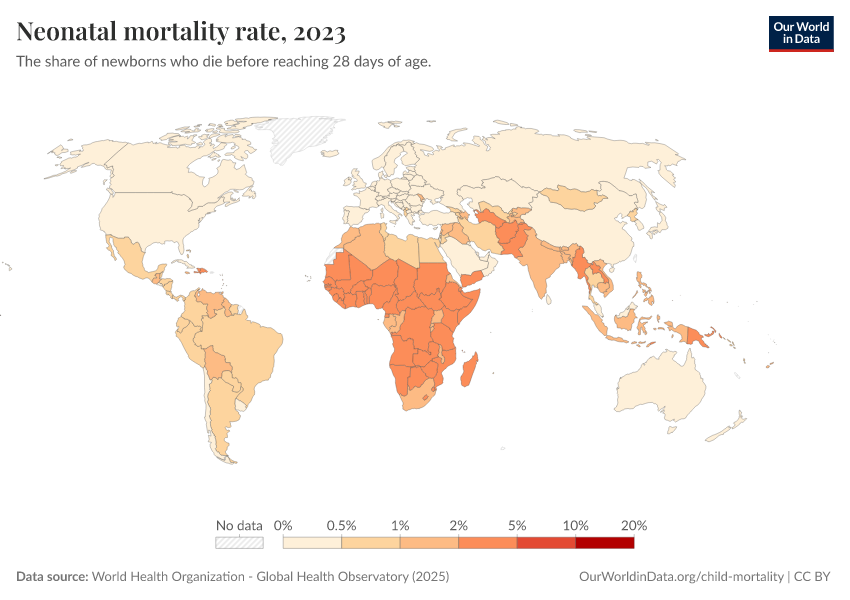 World Health Organization - Global Health Observatory (2025) – processed by Our World in Data. “Neonatal mortality rate” [dataset]. World Health Organization, “Global Health Observatory” [original data]. Retrieved February 27, 2026 from https://data-chartpreview-unify.owid.pages.dev:8789/20260119-070102/grapher/neonatal-mortality-rate-gho.html (archived on January 19, 2026).