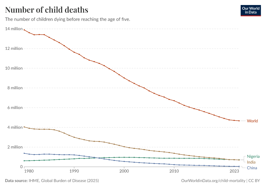 “Data Page: Number of child deaths”, part of the following publication: Esteban Ortiz-Ospina and Max Roser (2016) - “Global Health”. Data adapted from IHME, Global Burden of Disease. Retrieved from https://data-chartpreview-unify.owid.pages.dev:8789/20260211-174736/grapher/number-of-child-deaths.html [online resource] (archived on February 11, 2026).How to cite this data
