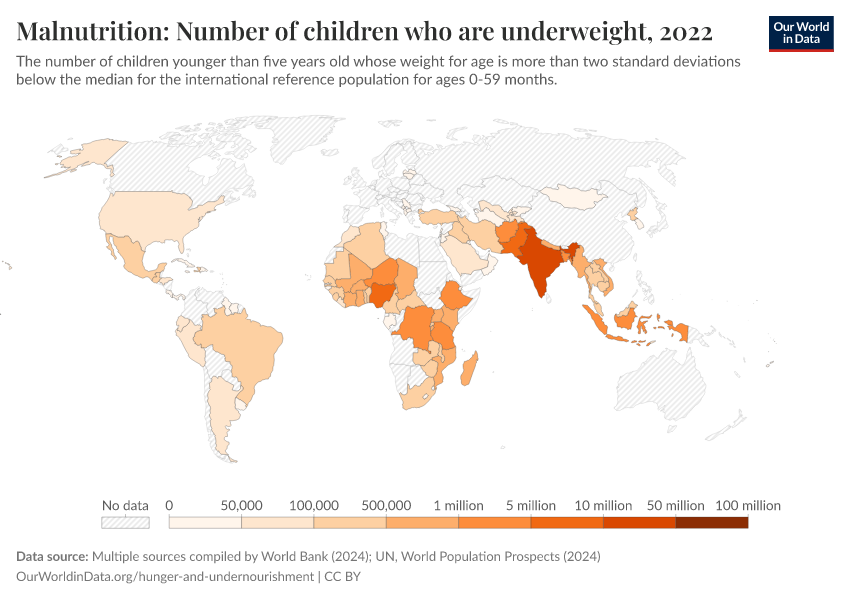 “Data Page: Number of underweight children”. Our World in Data (2026). Data adapted from UNICEF, WHO, World Bank, United Nations. Retrieved from https://data-chartpreview-unify.owid.pages.dev:8789/20260119-070102/grapher/number-of-children-who-are-underweight.html [online resource] (archived on January 19, 2026).How to cite this data