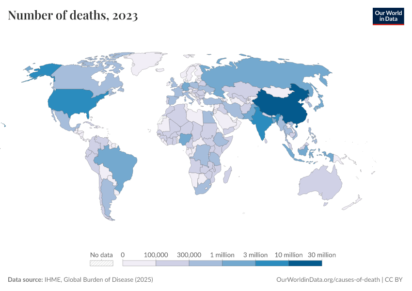 “Data Page: Number of deaths”, part of the following publication: Esteban Ortiz-Ospina and Max Roser (2016) - “Global Health”. Data adapted from IHME, Global Burden of Disease. Retrieved from https://data-chartpreview-unify.owid.pages.dev:8789/20260211-174736/grapher/number-of-deaths-gbd.html [online resource] (archived on February 11, 2026).How to cite this data
