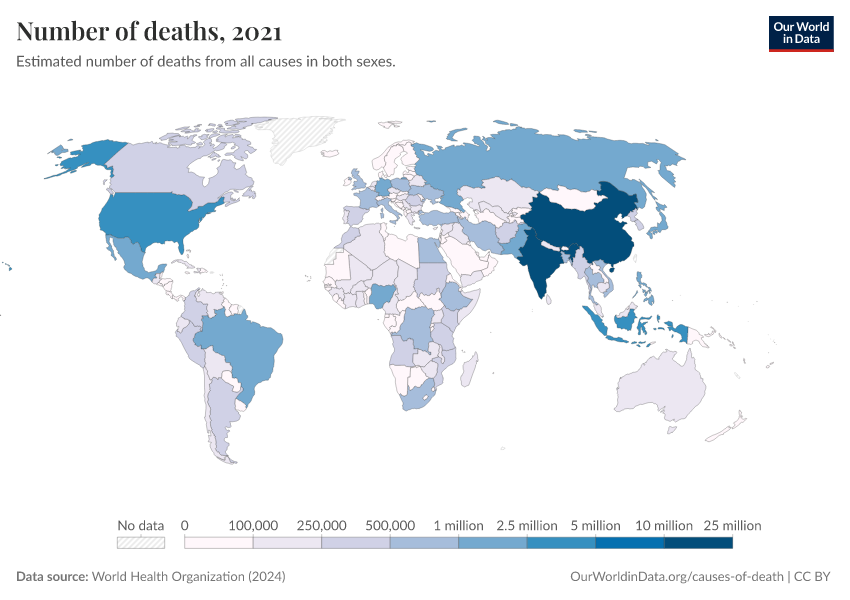 “Data Page: Number of deaths”, part of the following publication: Esteban Ortiz-Ospina and Max Roser (2016) - “Global Health”. Data adapted from World Health Organization. Retrieved from https://data-chartpreview-unify.owid.pages.dev:8789/20250909-093708/grapher/number-of-deaths-who.html [online resource] (archived on September 9, 2025).How to cite this data