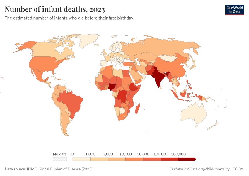 IHME, Global Burden of Disease (2025) – with minor processing by Our World in Data. “Number of infant deaths” [dataset]. IHME, Global Burden of Disease, “Global Burden of Disease - Child Mortality” [original data]. Retrieved February 27, 2026 from https://data-chartpreview-unify.owid.pages.dev:8789/20260213-140117/grapher/number-of-infant-deaths-ihme.html (archived on February 13, 2026).