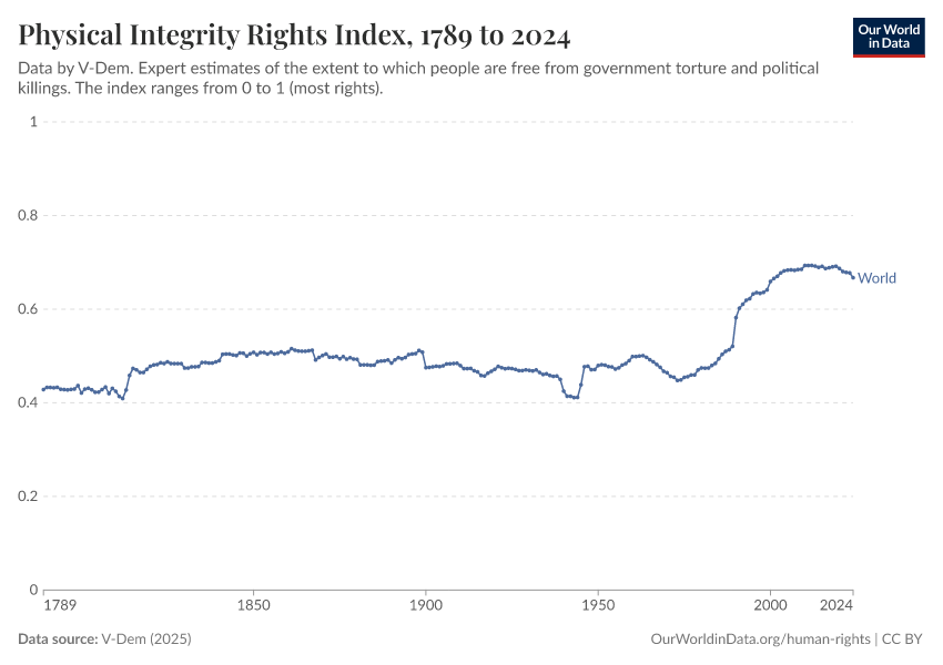 V-Dem (2025) – processed by Our World in Data. “Physical violence index – V-Dem” [dataset]. V-Dem, “Democracy report v15” [original data]. Retrieved February 27, 2026 from https://data-chartpreview-unify.owid.pages.dev:8789/20260119-070102/grapher/physical-integrity-rights-index-vdem.html (archived on January 19, 2026).