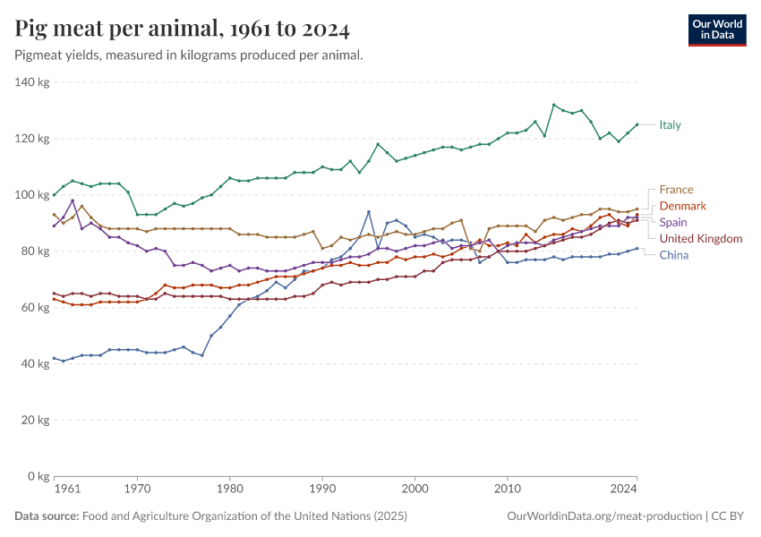 Food and Agriculture Organization of the United Nations (2025) – with major processing by Our World in Data. “Pig meat yield per animal – UN FAO” [dataset]. Food and Agriculture Organization of the United Nations, “Production: Crops and livestock products” [original data]. Retrieved February 27, 2026 from https://data-chartpreview-unify.owid.pages.dev:8789/20260116-143329/grapher/pig-yields-meat-per-animal-in-hectograms-100-grams.html (archived on January 16, 2026).