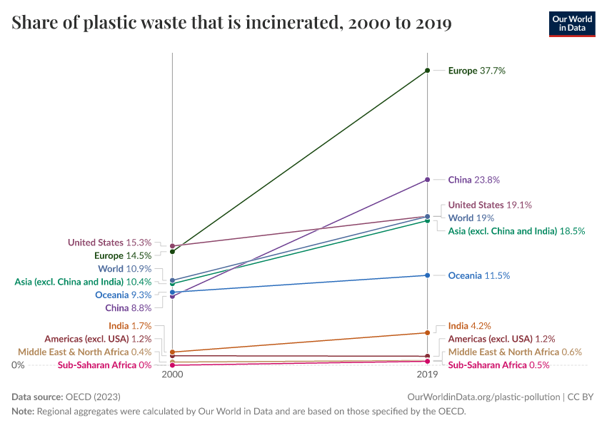 OECD (2023) – processed by Our World in Data. “Share of plastic waste that is incinerated” [dataset]. OECD, “Global Plastics Outlook - Plastics waste by region and end-of-life fate” [original data]. Retrieved February 27, 2026 from https://data-chartpreview-unify.owid.pages.dev:8789/20250909-093708/grapher/plastic-waste-incinerated.html (archived on September 9, 2025).