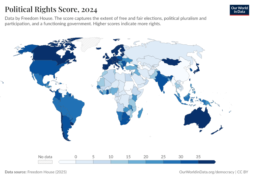 Freedom House (2025) – processed by Our World in Data. “Political Rights Score” [dataset]. Freedom House, “Freedom in the World” [original data]. Retrieved February 27, 2026 from https://data-chartpreview-unify.owid.pages.dev:8789/20260204-170225/grapher/political-rights-score-fh.html (archived on February 4, 2026).