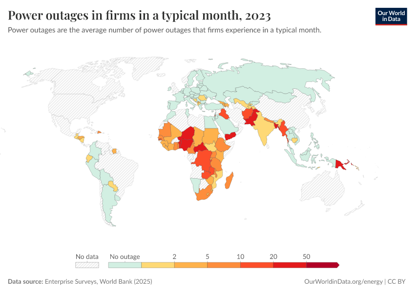 “Data Page: Power outages in firms in a typical month”. Our World in Data (2026). Data adapted from Enterprise Surveys, World Bank. Retrieved from https://data-chartpreview-unify.owid.pages.dev:8789/20260105-133053/grapher/power-outages-in-firms-per-month.html [online resource] (archived on January 5, 2026).