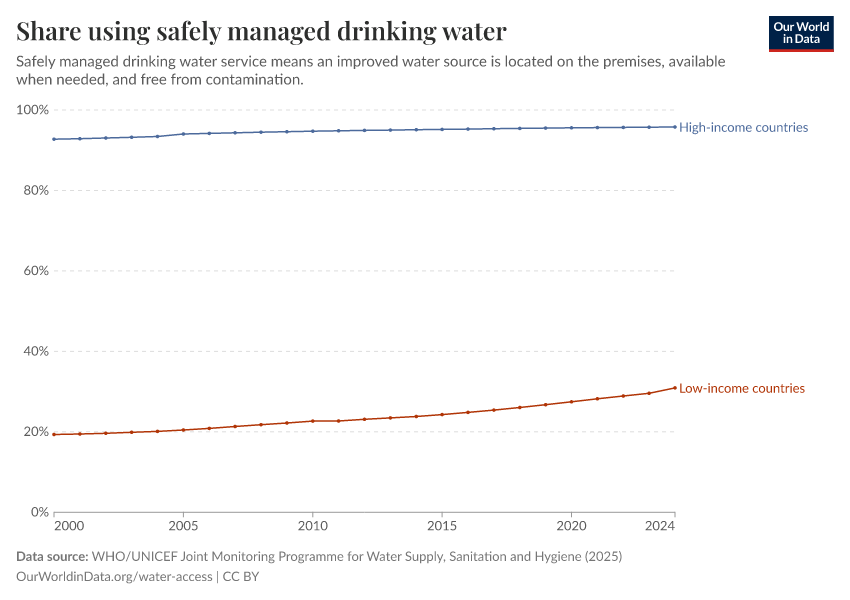 WHO/UNICEF Joint Monitoring Programme for Water Supply, Sanitation and Hygiene (2025) – processed by Our World in Data. “Share using safely managed drinking water” [dataset]. World Health Organization/UNICEF Joint Monitoring Programme for Water Supply, Sanitation and Hygiene, “WHO/UNICEF Joint Monitoring Programme for Water Supply, Sanitation and Hygiene (JMP) 2000-2024 report” [original data]. Retrieved February 27, 2026 from https://data-chartpreview-unify.owid.pages.dev:8789/20260116-114957/grapher/proportion-using-safely-managed-drinking-water.html (archived on January 16, 2026).