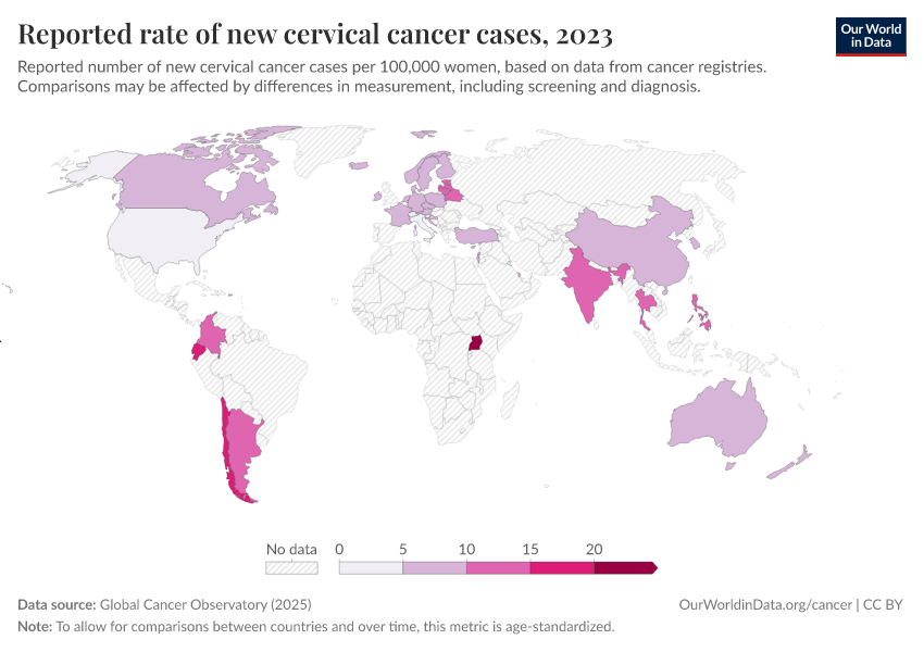“Data Page: Reported rate of new cervical cancer cases”, part of the following publication: Saloni Dattani, Veronika Samborska, Hannah Ritchie, and Max Roser (2024) - “Cancer”. Data adapted from Global Cancer Observatory. Retrieved from https://data-chartpreview-unify.owid.pages.dev:8789/20250909-093708/grapher/reported-rate-of-new-cervical-cancer-cases.html [online resource] (archived on September 9, 2025).How to cite this data
