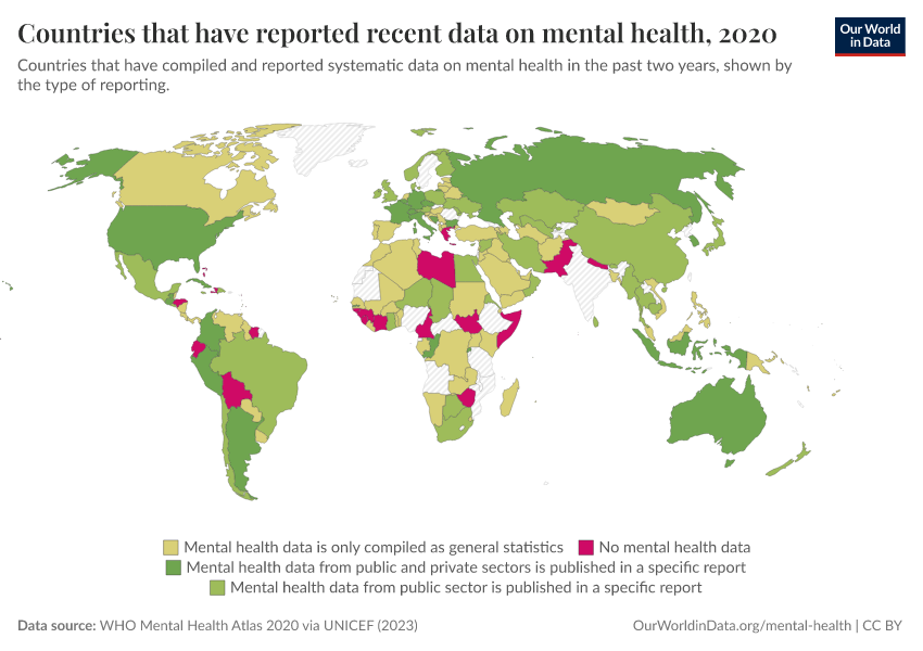 WHO Mental Health Atlas 2020 via UNICEF (2023) – with major processing by Our World in Data. “Countries that have reported recent data on mental health” [dataset]. WHO Mental Health Atlas 2020 via UNICEF, “Countdown for Global Mental Health 2030” [original data]. Retrieved February 27, 2026 from https://data-chartpreview-unify.owid.pages.dev:8789/20260224-141219/grapher/reporting-of-mental-health-system-data-in-the-past-two-years.html (archived on February 24, 2026).
