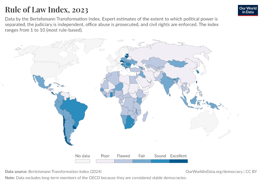 It ranges from countries with poor rule of law (scores of 1 to 2.49), over flawed rule of law (scores of 2.5 to 4.49), fair rule of law (scores of 4.5 to 6.49), and sound rule of law (scores of 6.5 to 8.49), to countries with excellent rule of law (scores of 8.5 to 10).