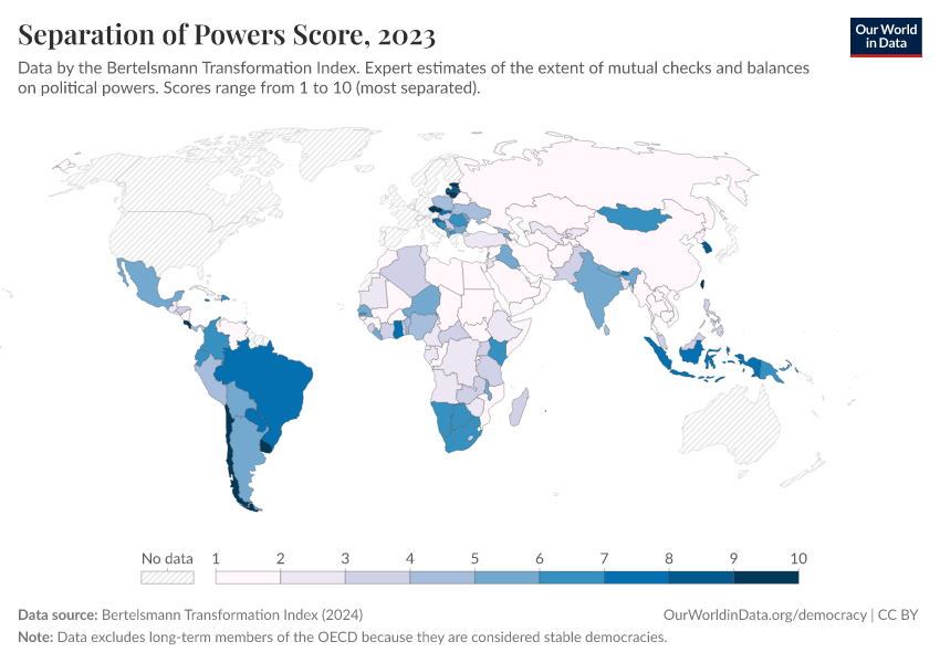 Bertelsmann Transformation Index (2024) – processed by Our World in Data. “Separation of Powers Score” [dataset]. Bertelsmann Transformation Index, “Bertelsmann Transformation Index, Scores” [original data]. Retrieved February 27, 2026 from https://data-chartpreview-unify.owid.pages.dev:8789/20260204-165456/grapher/separation-of-powers-score-bti.html (archived on February 4, 2026).
