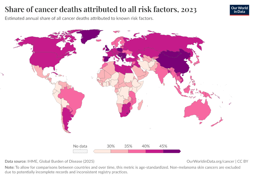 IHME, Global Burden of Disease (2025) – processed by Our World in Data. “Share of cancer deaths attributed to all risk factors” [dataset]. IHME, Global Burden of Disease, “Global Burden of Disease - Risk Factors for Cancer Deaths” [original data]. Retrieved February 27, 2026 from https://data-chartpreview-unify.owid.pages.dev:8789/20260213-144351/grapher/share-of-cancer-deaths-attributed-to-all-risk-factors.html (archived on February 13, 2026).