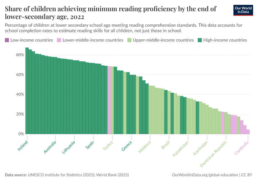 “Data Page: Share of children achieving minimum reading proficiency by the end of lower secondary age”, part of the following publication: Hannah Ritchie, Veronika Samborska, Esteban Ortiz-Ospina, and Max Roser (2023) - “Global Education”. Data adapted from UNESCO Institute for Statistics. Retrieved from https://data-chartpreview-unify.owid.pages.dev:8789/20260122-091445/grapher/share-of-children-reaching-sufficient-reading-comprehension-by-the-end-of-lower-secondary-age.html [online resource] (archived on January 22, 2026).How to cite this data