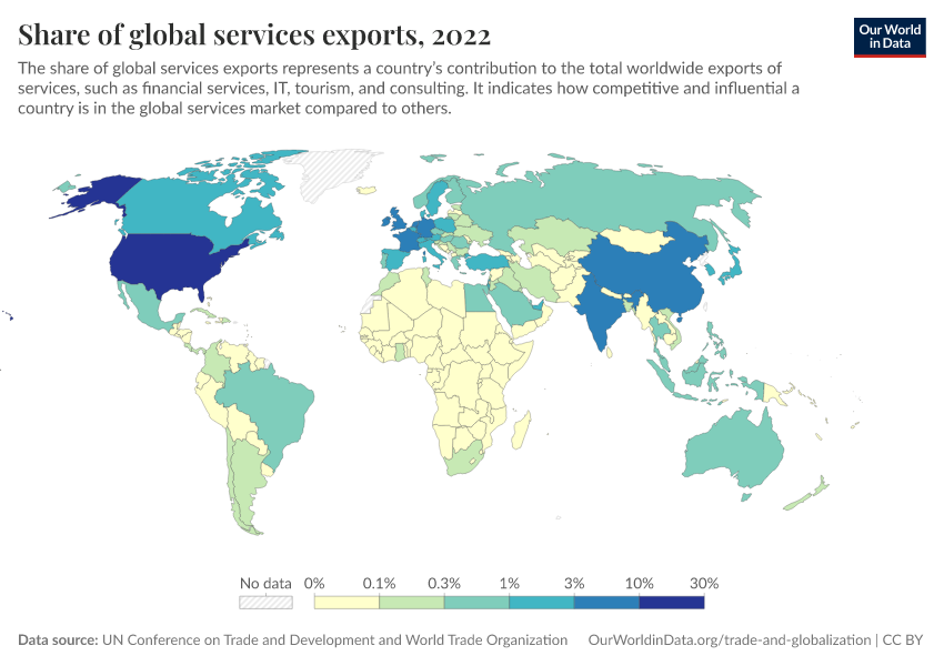 “Data Page: Share of global services exports”. Our World in Data (2026). Data adapted from UN Conference on Trade and Development and World Trade Organization. Retrieved from https://data-chartpreview-unify.owid.pages.dev:8789/20260130-180113/grapher/share-of-global-services-exports.html [online resource] (archived on January 30, 2026).How to cite this data