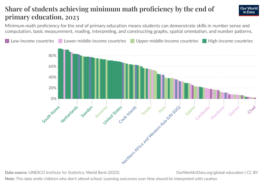“Data Page: Share of students achieving minimum math proficiency by the end of primary education”. Our World in Data (2026). Data adapted from UNESCO Institute for Statistics. Retrieved from https://data-chartpreview-unify.owid.pages.dev:8789/20260130-180113/grapher/share-of-students-at-end-of-primary-education-achieving-minimum-math-proficiency.html [online resource] (archived on January 30, 2026).How to cite this data