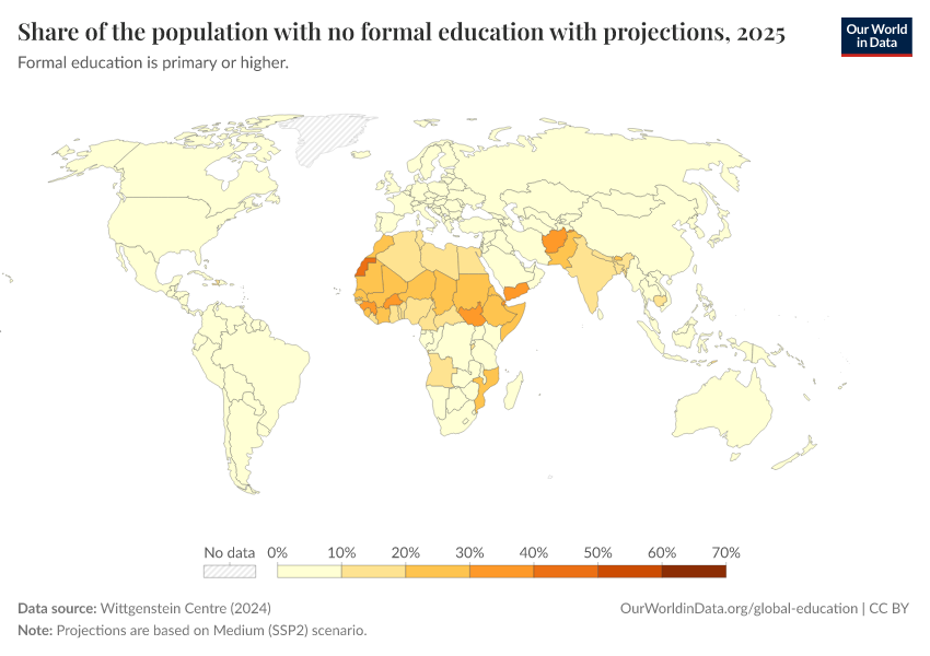 “Data Page: Share of the population with no formal education with projections”, part of the following publication: Hannah Ritchie, Veronika Samborska, Esteban Ortiz-Ospina, and Max Roser (2023) - “Global Education”. Data adapted from Wittgenstein Centre. Retrieved from https://data-chartpreview-unify.owid.pages.dev:8789/20260212-032504/grapher/share-of-the-population-with-no-formal-education-with-projections.html [online resource] (archived on February 12, 2026).How to cite this data