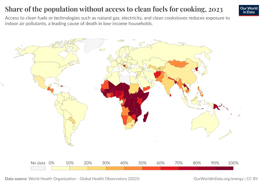 World Health Organization - Global Health Observatory (2025) – processed by Our World in Data. “Share of the population without access to clean fuels for cooking” [dataset]. World Health Organization, “Global Health Observatory” [original data]. Retrieved February 27, 2026 from https://data-chartpreview-unify.owid.pages.dev:8789/20260119-070102/grapher/share-of-the-population-without-access-to-clean-fuels-for-cooking.html (archived on January 19, 2026).